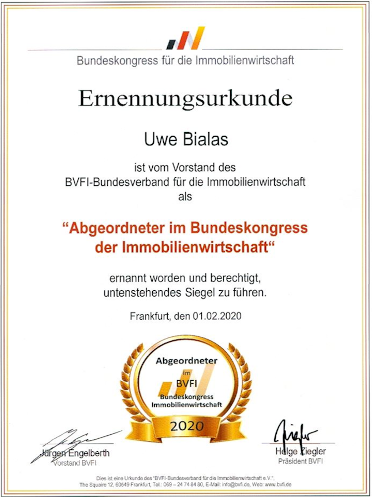 Als parlamentarisches Mitglied sitzt MunichReal Bialas & Bialas GmbH Geschäftsführer Uwe Bialas ab sofort für München/Bayern als Abgeordneter im Bundeskongress und nimmt somit eine bedeutsame Rolle in der bundesweiten Vertretung der Immobilienbranche wahr. Als Abgeordneter besteht die Aufgabe von Uwe Bialas zunächst in der Interessenvertretung des Bvfi, aber auch in der Kontaktpflege zur Basis. Denn hauptsächlich aus ihr setzt sich der Bundesverband der Immobilienwirtschaft zusammen